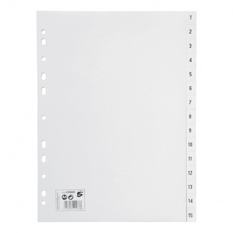 5 Starâ„¢ Office is a competitive range of office stationery. These A4 file dividers made from polypropylene contain 1-15 separate tabs with multipunched holes to keep your documents organised in your ring binder or lever arch file. File dividers are a convenient way of keeping track of your documents when you have them stored in folders. The file dividers from 5 Starâ„¢ Office are made from quality polypropylene for additional durability and contain 15 separate sheets with white coloured tabs and black text to keep your work separated. Suitable for all types of folders and available as a single set of dividers.