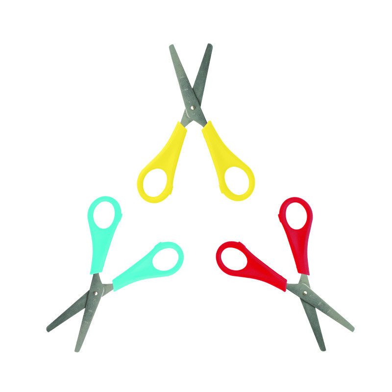 5 Star Office 130mm school scissors. A display box of 30 pairs of school scissors with stainless steel blades. 10 each of red, yellow and turquoise.