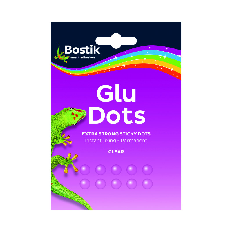 Bostik Extra Strong Glu Dots are circles of clear, extra strong glue which sticks to almost any flat surface. Suitable for use on paper, wood, plastic, metal glass and painted surfaces, these glu dots are ideal for gift wrapping, photo albums, craft projects and instant fixing. Made from an acid and lignin free formula, the non-yellowing dots have a diameter of approximately 10mm.