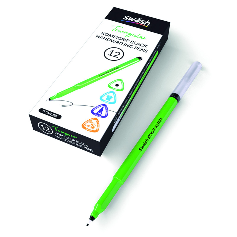 Aid and improve handwriting for both left and right-handed users with Swash KOMFIGRIP handwriting pens. Each pen benefits from: a triangular grip to encourage the correct writing posture, a hard-wearing, pressure-resistant tip, and a universal clear, ventilated lid. The slim barrel is easy for small hands to hold and control, and the ink is rapid drying with virtually no bleed-through - ideal for left-handed users! The impressive 14-day cap-off time prevents drying out, which makes these pens last even longer in the busy classroom environment. Pack contains 12 handwriting pens.